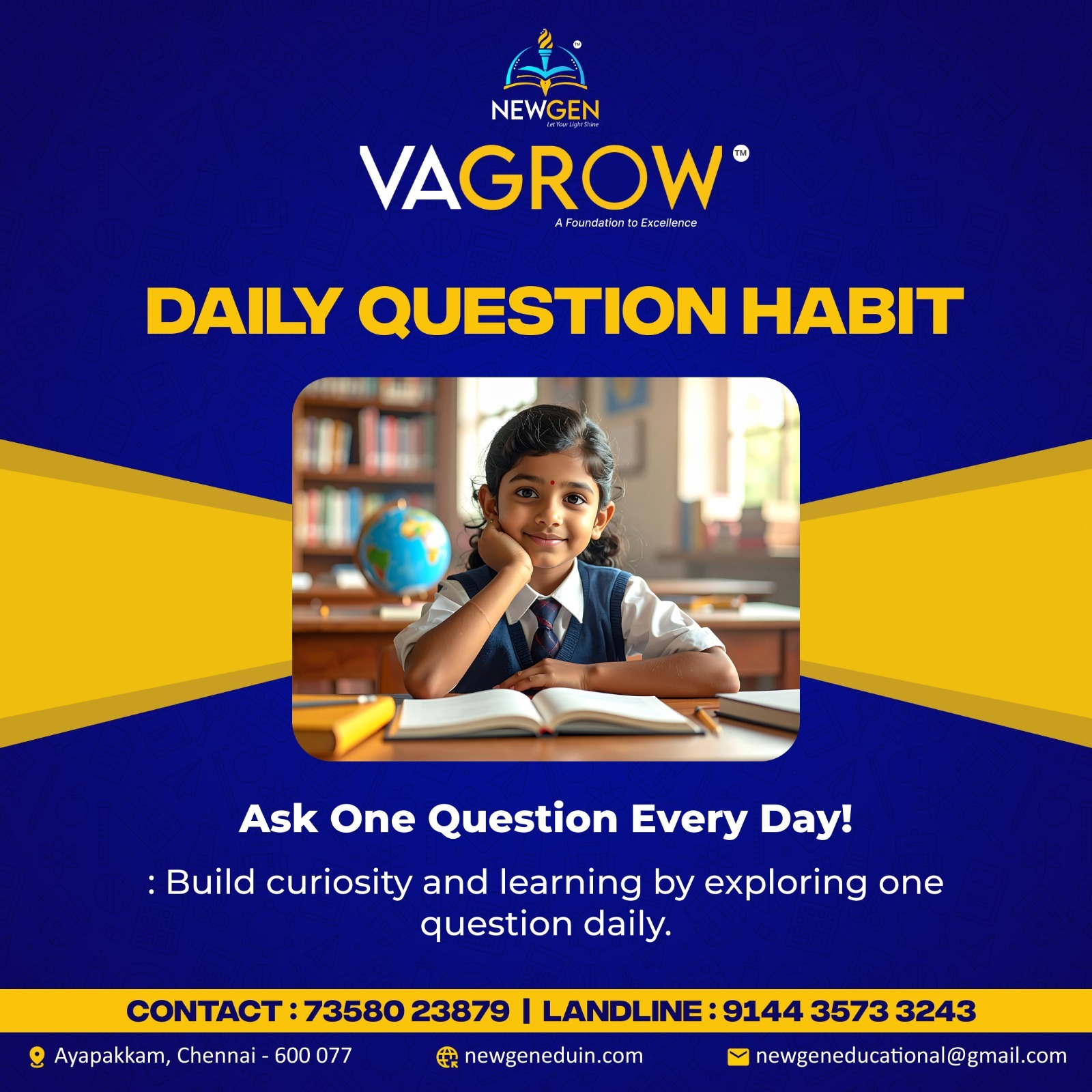 Daily Question Hunt π NewGen Education Institute β Empowering Students from 4th to 12th Grade! We offer comprehensive coaching to help students achieve academic excellence and prepare for competitive exams like NEET and JEE. Our programs are designed to build strong foundations, boost confidence, and unlock each studentβs full potential. π Our Courses πΉ Foundation Program (4th to 8th Std) Strengthen core concepts in subjects like Math, Science, and English with engaging, concept-based teaching. πΉ Advanced Coaching (9th to 12th Std) Score high in board exams (CBSE & State Board) through structured lessons, strategic test prep, and expert mentoring. πΉ NEET & JEE Preparation Crack medical and engineering entrance exams with advanced coaching, mock tests, and personalized guidance. π Why Choose NewGen? β Expert & Experienced Faculty β Small Batches for Personalized Attention β Affordable Fees with Maximum Value β Regular Tests & Performance Analysis β Individual Doubt-Clearing Sessions β Motivation & Career Guidance β Parent-Teacher Updates & Student Monitoring π Located in Ayapakkam, Chennai π Contact Us π Website: newgeneduin.com π Call: 73580 23879 βοΈ Landline: 91443 5733243 π Follow & Support Us Online! #NewgenEducationInstitute #NEETPreparation #JEEPreparation #CoachingCenter #AcademicSuccess #CBSE #StateBoard #TuitionClasses #9thStandard #10thStandard #11thStandard #12thStandard #StudentSupport #EducationInChennai #SchoolCoaching #StudySmart #KnowledgeIsPower
