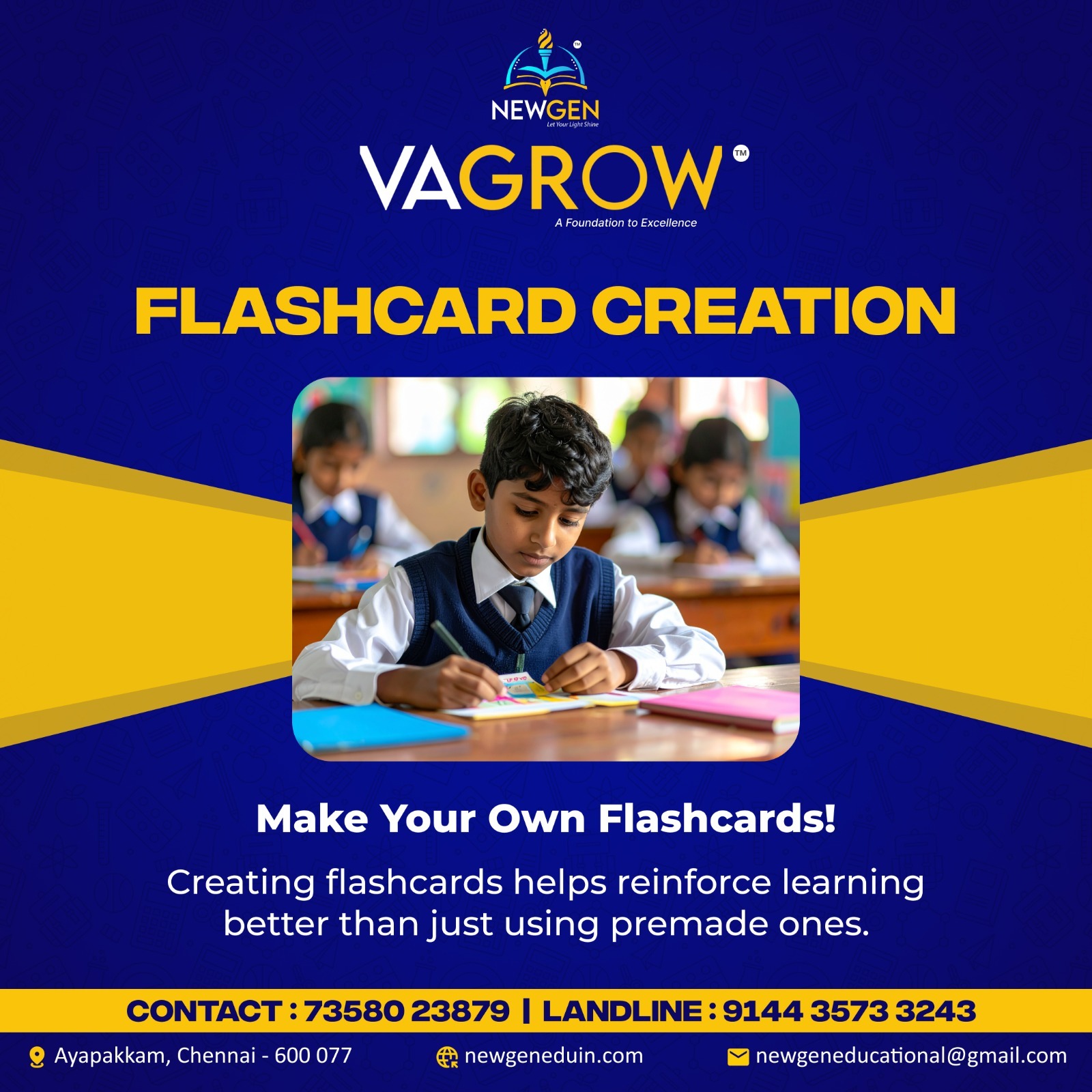 Flashcard Creation π NewGen Education Institute β Empowering Students from 4th to 12th Grade! We offer comprehensive coaching to help students achieve academic excellence and prepare for competitive exams like NEET and JEE. Our programs are designed to build strong foundations, boost confidence, and unlock each studentβs full potential. π Our Courses πΉ Foundation Program (4th to 8th Std) Strengthen core concepts in subjects like Math, Science, and English with engaging, concept-based teaching. πΉ Advanced Coaching (9th to 12th Std) Score high in board exams (CBSE & State Board) through structured lessons, strategic test prep, and expert mentoring. πΉ NEET & JEE Preparation Crack medical and engineering entrance exams with advanced coaching, mock tests, and personalized guidance. π Why Choose NewGen? β Expert & Experienced Faculty β Small Batches for Personalized Attention β Affordable Fees with Maximum Value β Regular Tests & Performance Analysis β Individual Doubt-Clearing Sessions β Motivation & Career Guidance β Parent-Teacher Updates & Student Monitoring π Located in Ayapakkam, Chennai π Contact Us π Website: newgeneduin.com π Call: 73580 23879 βοΈ Landline: 91443 5733243 π Follow & Support Us Online! #NewgenEducationInstitute #NEETPreparation #JEEPreparation #CoachingCenter #AcademicSuccess #CBSE #StateBoard #TuitionClasses #9thStandard #10thStandard #11thStandard #12thStandard #StudentSupport #EducationInChennai #SchoolCoaching #StudySmart #KnowledgeIsPower